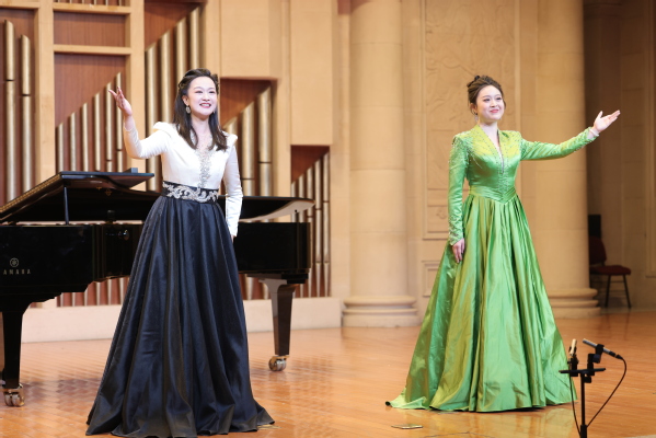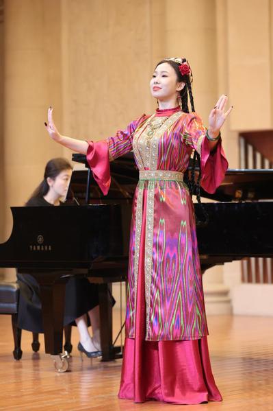 音乐会以古典诗词艺术歌曲《月满西楼》启幕,旋律婉转、演绎深情,营造出浓郁的艺术氛围。随后上演的地方民歌联唱洋溢鲜明地域风情:新疆民歌《一杯美酒》热情奔放,回族民歌《尕妹妹的山丹红花开》质朴灵动,乌孜别克族男女对唱《黑眉毛的姑娘》韵律独特,生动诠释了我国多民族音乐文化的交融与魅力。一系列具有浓郁民族风格的创作歌曲进一步拓展了音乐表达的维度,朝鲜族风韵的《阿拉里呦》、蒙古族情怀的《梦中的额吉》以及藏族情感的《有多远》,均展现出中华民族音乐语言的丰富性与感染力。